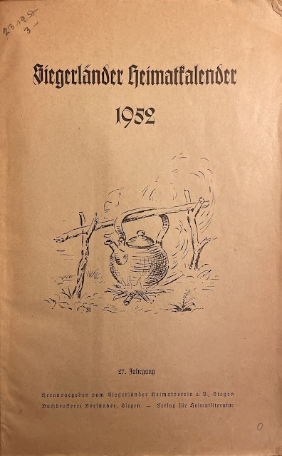 1952 | Siegerländer Heimatkalender 27. Jahrgang Siegen: Vorländer [1951] Softcover lt. ZDB: Siegerländer Heimatkalender [1.]1920 - 5[5.]1924, 6.1925 ff. Das Siegerland liegt im Bundesland Nordrhein-Westfalen. Übernahme eines Blogeintrags von ALLE JAHRE NEU - Almanach, Jahrbuch, Kalender. Dort finden sich zahlreiche Einträge zu weiteren Heimatkalendern. |